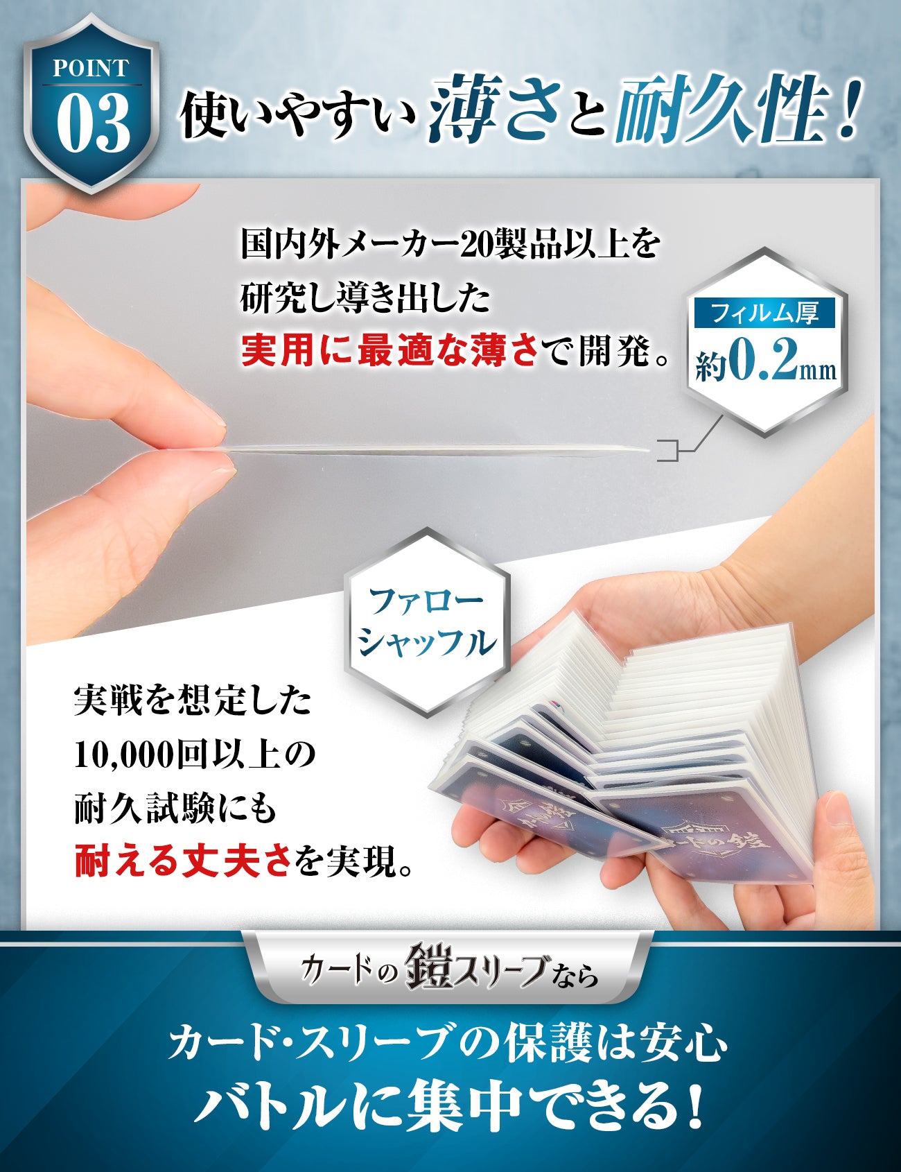 <注意>ご購入時にはご使用予定のカードのサイズ感をよくお確かめの上ご購入をお願いします。新品の正規販売は「カードの鎧 公式」のみです、別店舗でご購入いただいた場合サポート対象外となります。※現在パッケージデザイン更新中につきカタログと異なるパッケージが届く場合もありますが、商品に違いはありませんのでご安心ください。 「カードの鎧」は登録商標です。