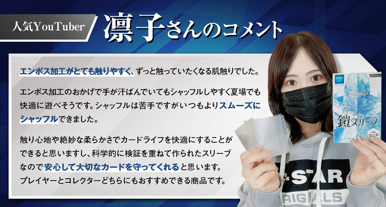 他にT社とB社品を使用した上での評価となります。コストパフォーマンスはT社>B社>鎧であるが、今後の継続購入は鎧一択になる。耐久性は勿論の事だが、シャッフルのしやすさと手への馴染む感じが圧倒的に良い。程よい柔軟性を兼ね備えており、スリーブ自体の乾燥感が他社品より弱く、少しねっとりしていると個人的には感じているが、そこが良い。金銭面に余裕があり、カードスリーブ代にもある程度お金を投資できる人なら、間違いなくおすすめです。