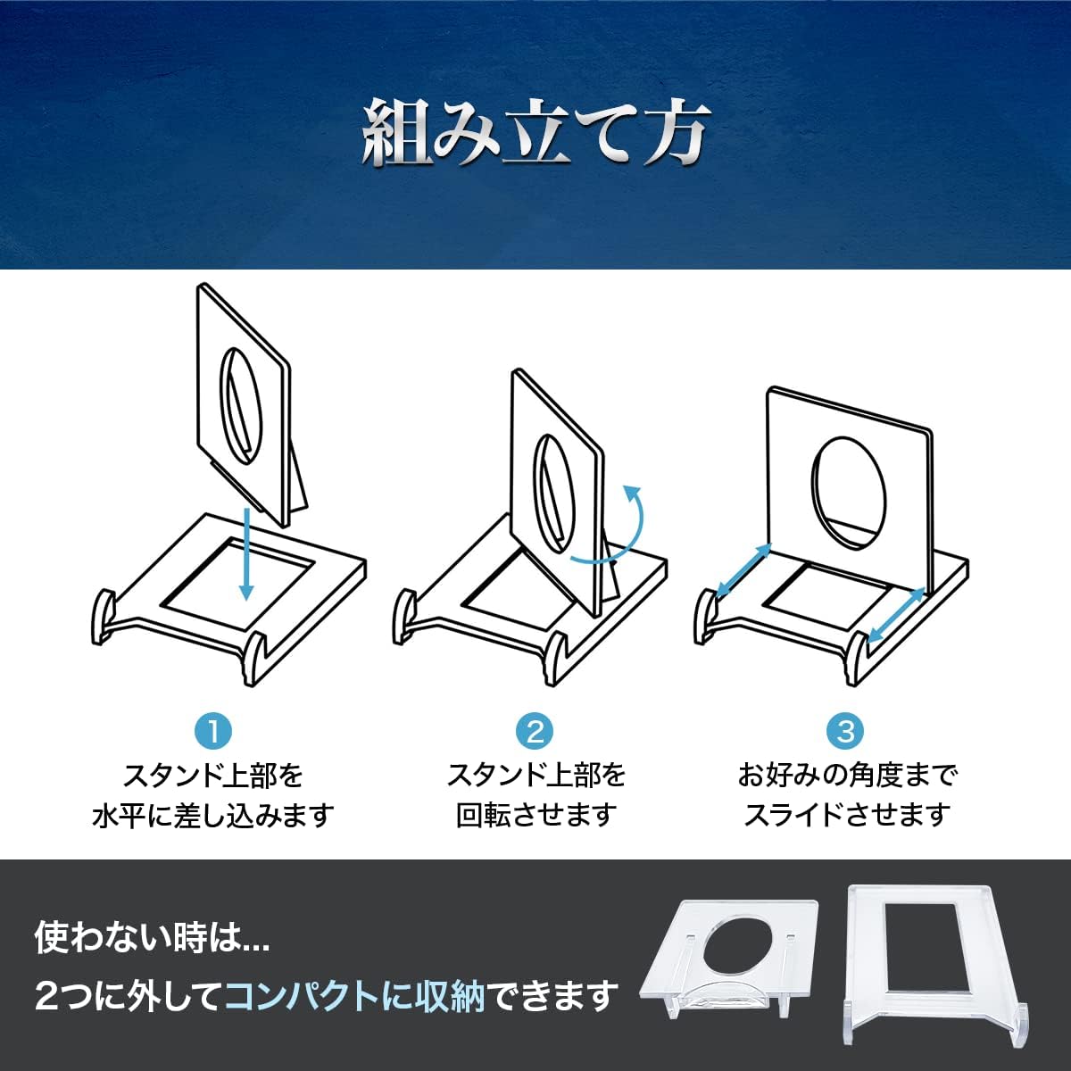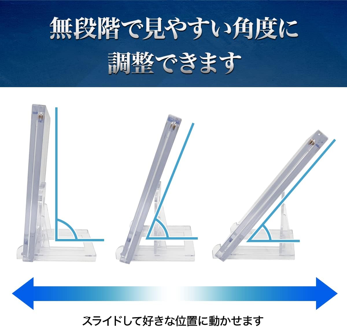 れおな 足だけなので自由度が高い。写真やステッカーも飾れるし角度調整ができる点が良い。しいていうなら、よくあるブラックな細長いスタンドタイプ?のものよりは設置場所の奥行きが必要になるかな本棚に並べた本の前のちょっとしたスペースに飾りたいってときにはちょっと不便。でも今のところ満足しているので☆は4で。