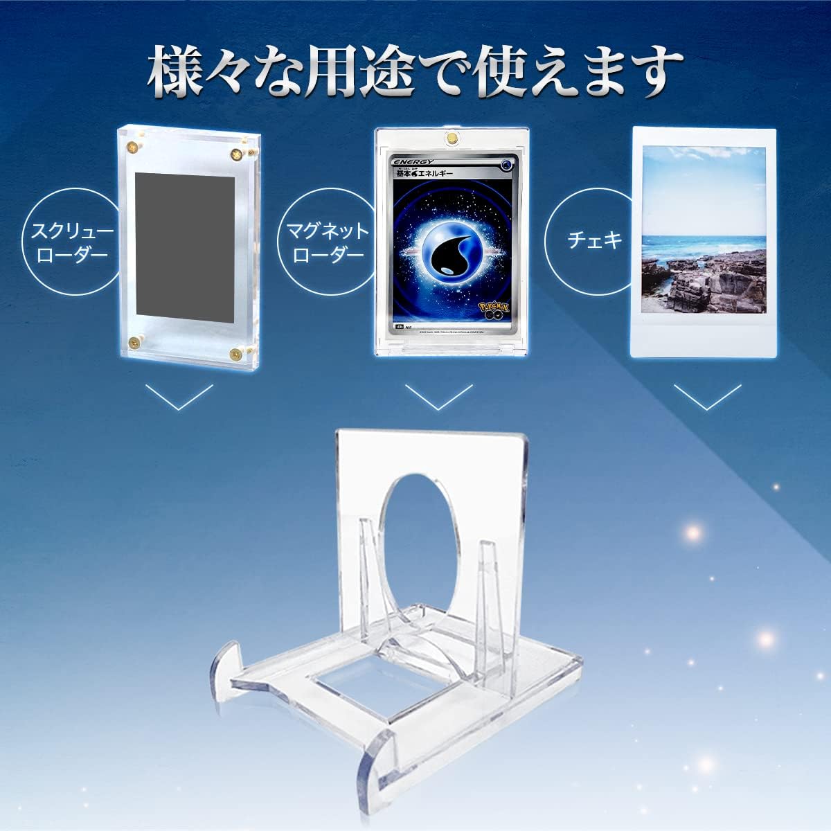 高透明のクリア素材を使用し、展示やSNS撮影にも最適。軽くて丈夫、安定感もあり、角度調整で縦置き・横置きの両方に対応。スタンド自体の主張を抑えながら、カードの魅力を引き立てる――「見せる」にこだわるコレクターに最適な設計です。